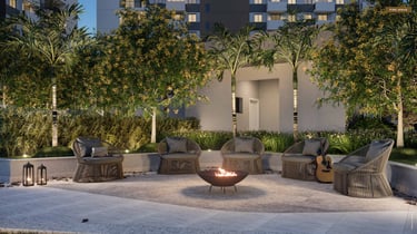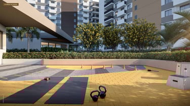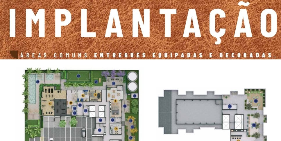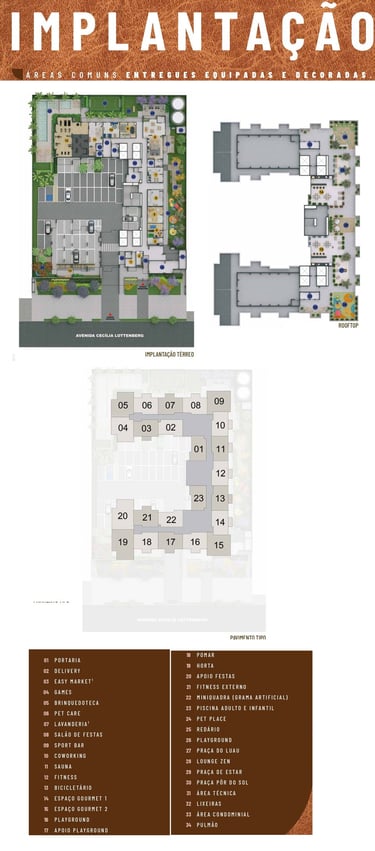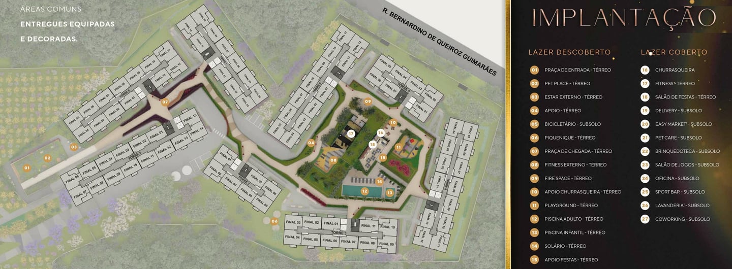 Apoio Piscina Adulto - Apoio Churrasqueira Piscina Infantil - Apoio Festas Playground - Bicicletário Piquinique - Estar Externo Praça de Chegada - Fire Space Praça de Entrada - Fitness Externo Solário - Pet Place -