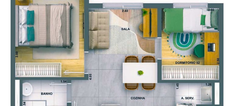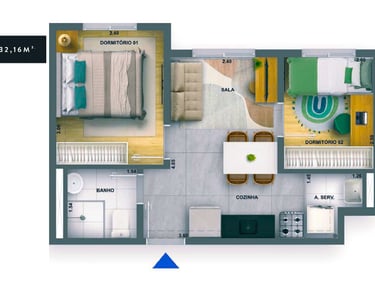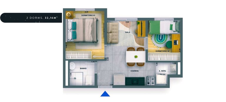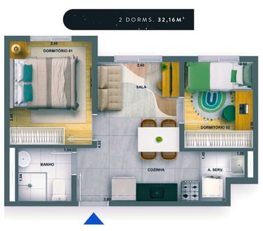 32m2 - 02 Dorms. sem terraço Finais: 01, 03, 04, 07, 08, 10, 12, 13, 16 e 17 (unidades de meio).