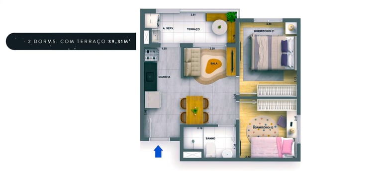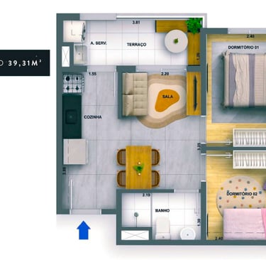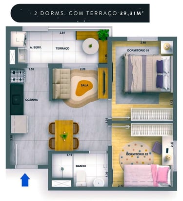 39m2 - 02 Dorms. com terraço Finais: 05, 06, 14 e 15 (unidades de ponta).