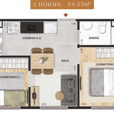 34m² - 02 Dorms. sem terraço - Finais: 04, 05, 07 (unidades de meio).