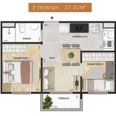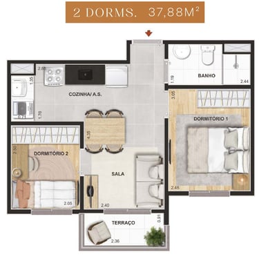 37m² - 02 Dorms. com terraço – Finais: 03,08,09,13,14,18 e 19 – (unidades de meio).