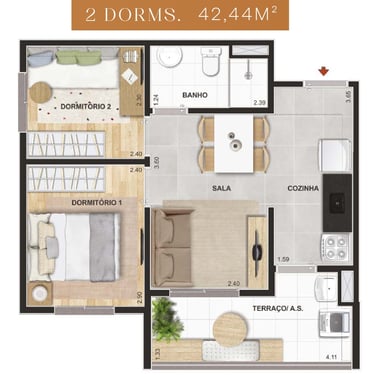 42m² - 02 Dorms. com terraço – Finais: 10 e 11 (unidades de ponta)