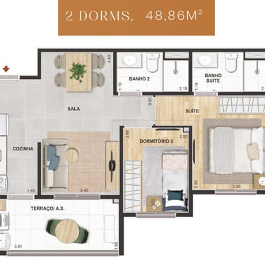 49m² - 02 Dorms. com suíte e terraço – Finais:01 e 20 (unidades de ponta)