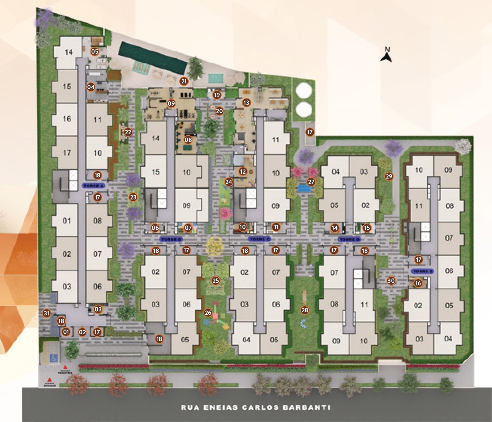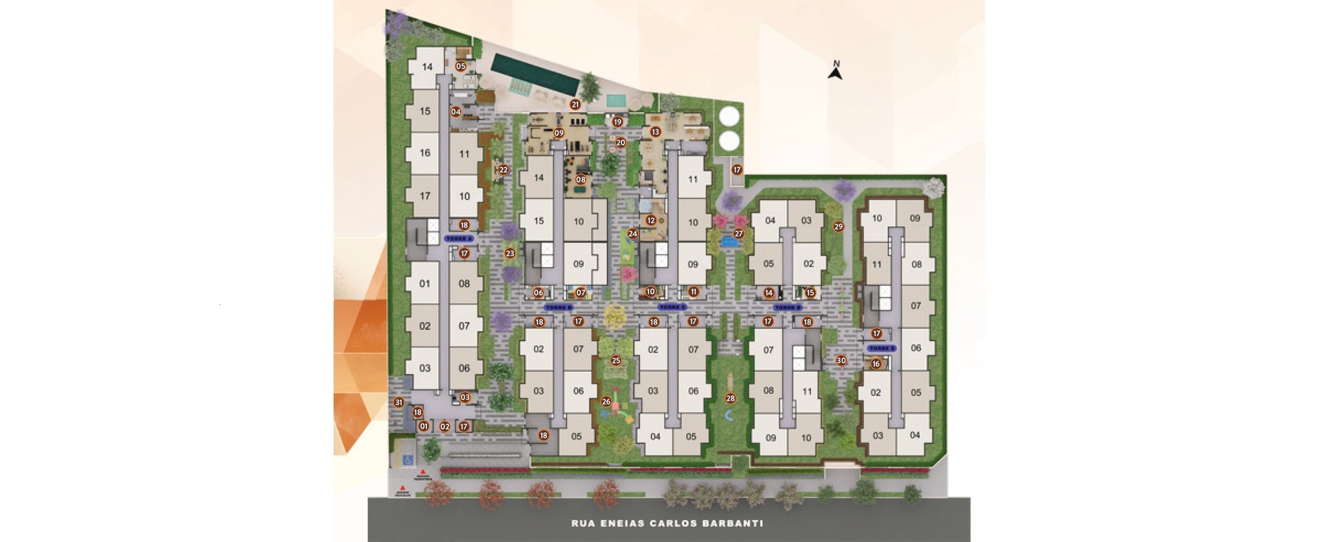 Apartamentos por Andar: Torre A -17 por andar./ Torre B e C -15 por andar/ Torre D e E -11 por andar