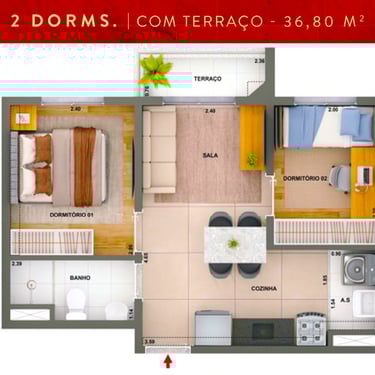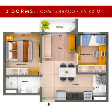 37m² - 02 Dorms. Com terraço – Finais: 01,02,03,06,07,08,09,10,11,14 e 15 (unidades de meio).