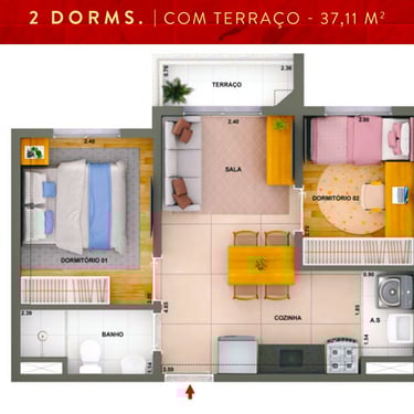 37m² - 02 Dorms. com terraço - Finais: 01, 02, 05,06,07 e 08 (unidades de meio).
