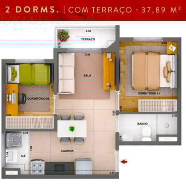 38m² - 02 Dorms. com terraço – Finais: 03,04, 09 e 10 (unidades de ponta).