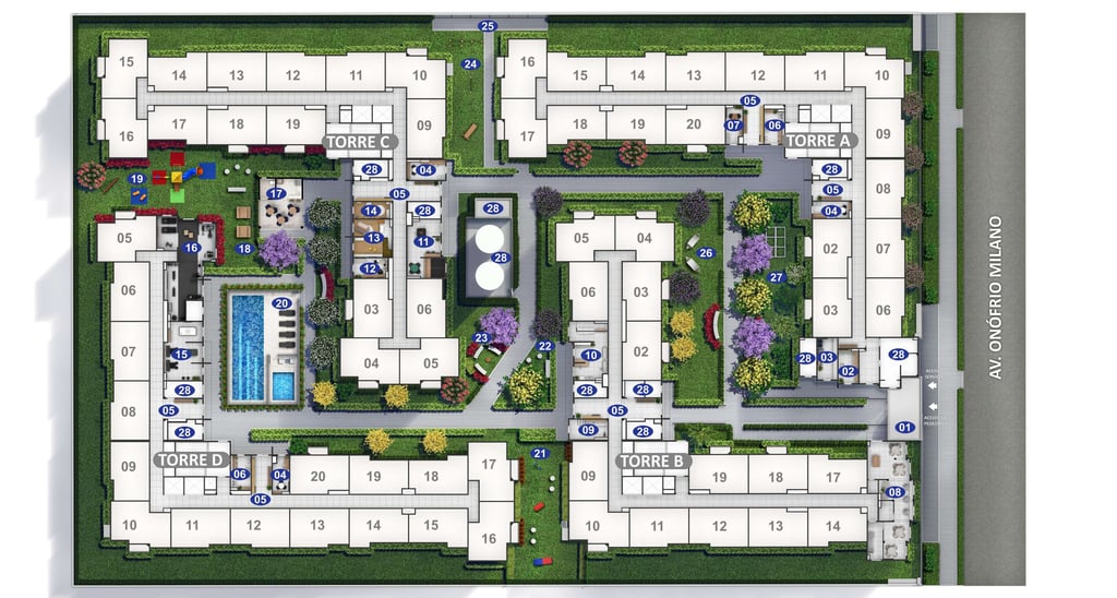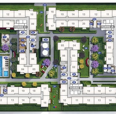 Apartamentos por Andar: Torres A e D: 21 por andar / Torres B e C: 19 por andar