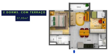 38m2 - 02 Dorms. com terraço - Finais: 04, 05, 10, 16 e 17 (unidades de ponta).