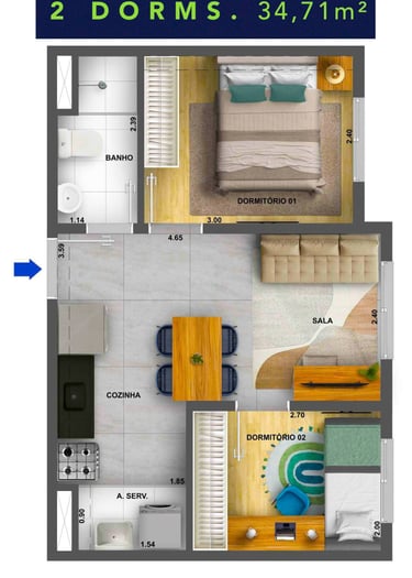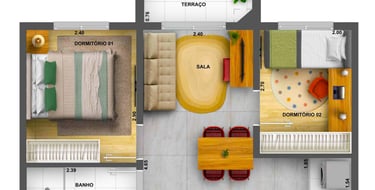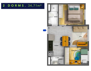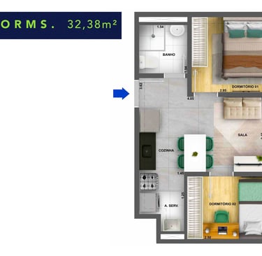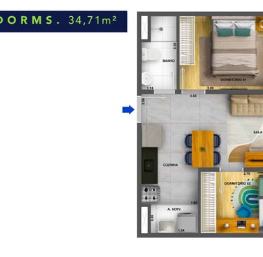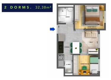 35m2 - 02 Dorms. sem terraço - Finais: 06, 07, 08, 09, 11, 12 e 13 (unidades de meio).