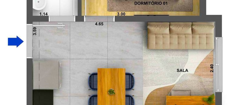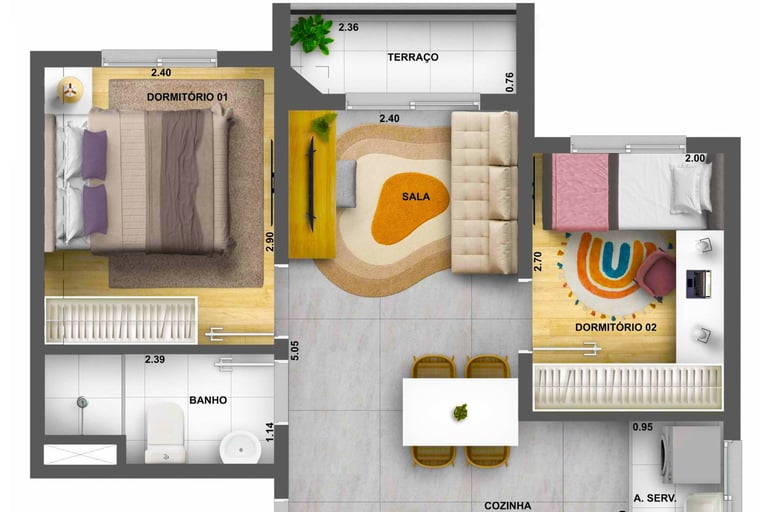 38m2 - 02 Dorms. com terraço - Finais: 04, 05, 10, 15 e 16 (unidades de ponta).