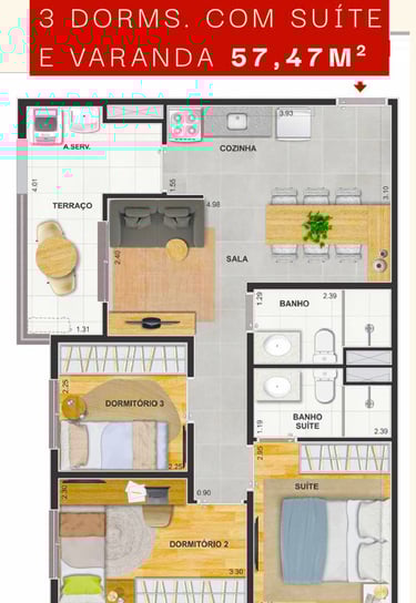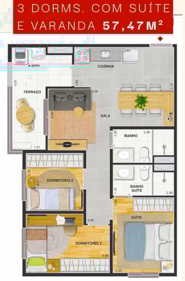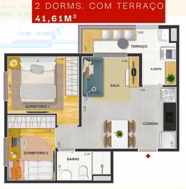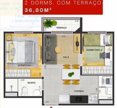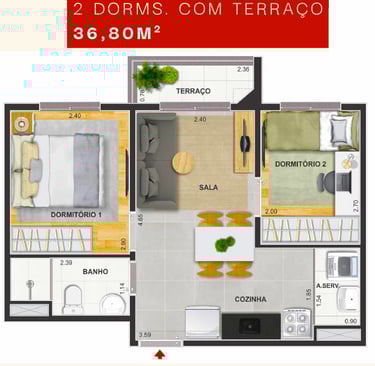 37m² - 02 Dorms. com terraço - Finais: 01, 02, 03, 06, 07, 08, 09, 10, 11, 14 e 15 (unidades de meio).