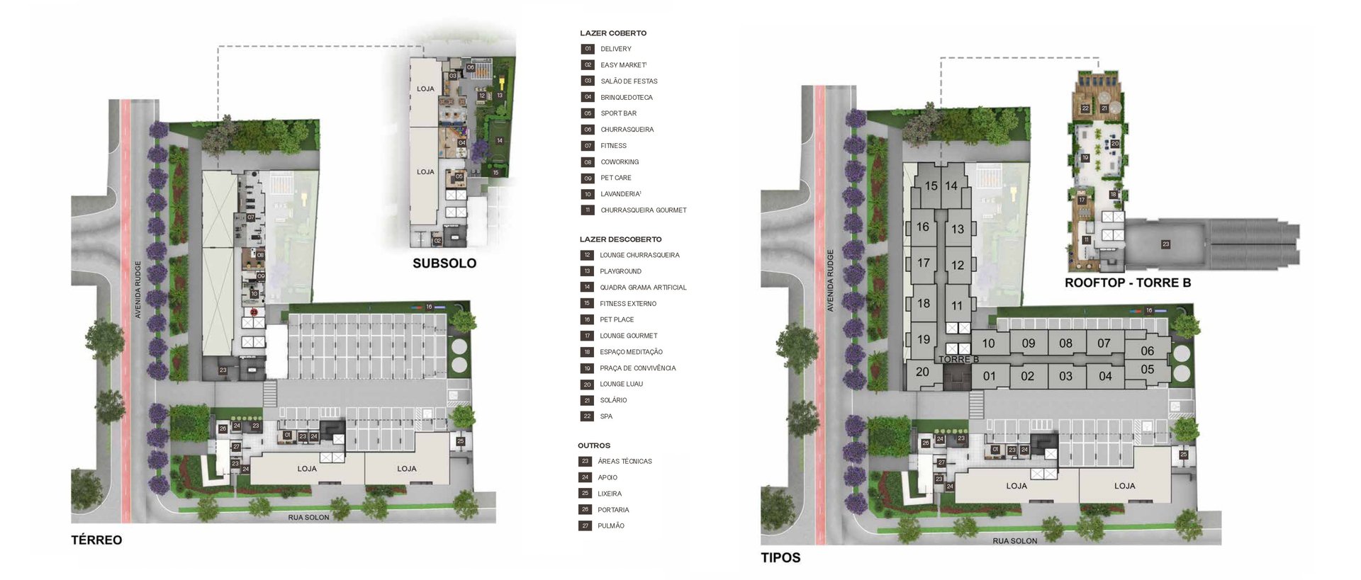 Coworking, Churrasqueiras Gourmet, Sport Bar, Churrasqueiras, Lounge Lual, Apoio Churrasqueira, Gourmet, Fitness Externo, Crossfit Externo, Lounge Jogos, Cine Open Air, Bar, Lounge Convivência