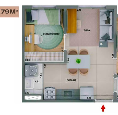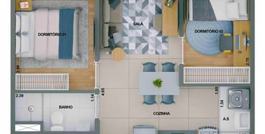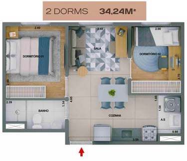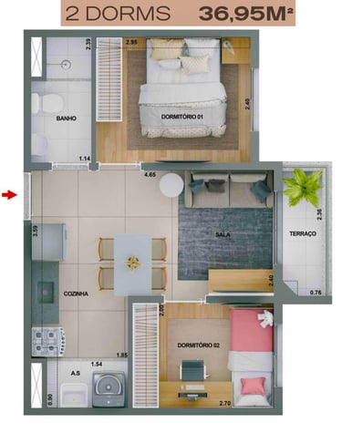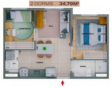 37m2 - 2 Dorms com Varanda, meio – Finais 04, 05 e 06